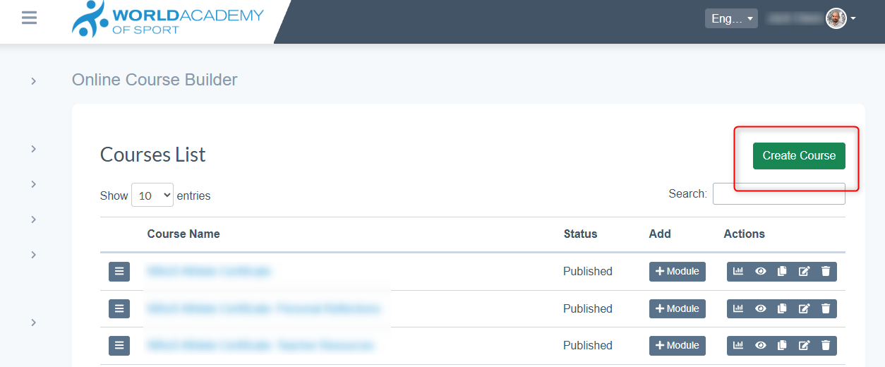 - Select 'Create Course' to create a new course