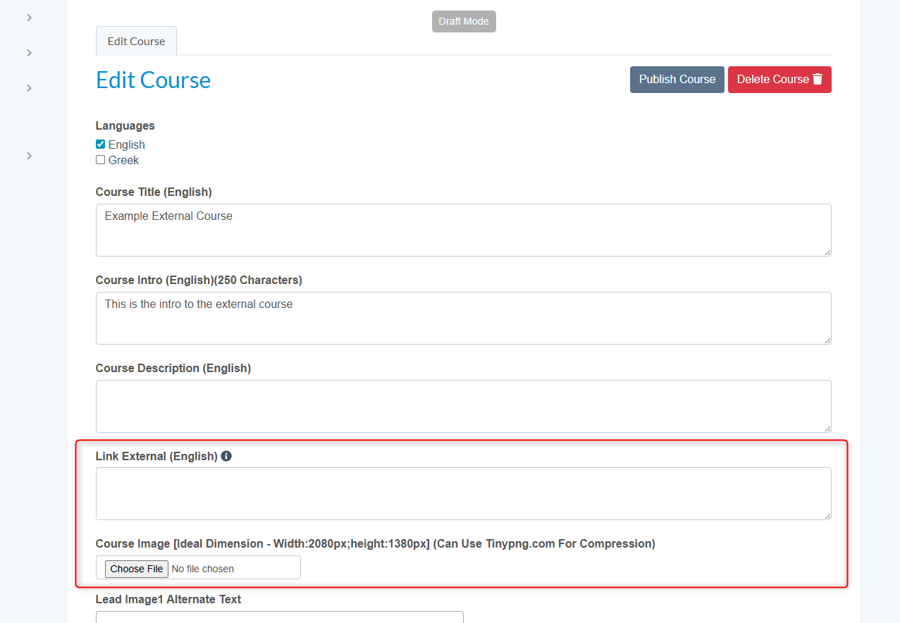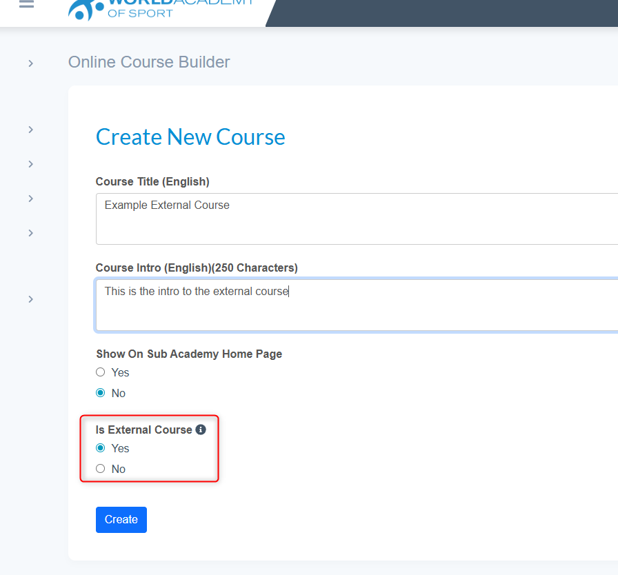 - To setup an external course make sure the radio button is set to Yes.