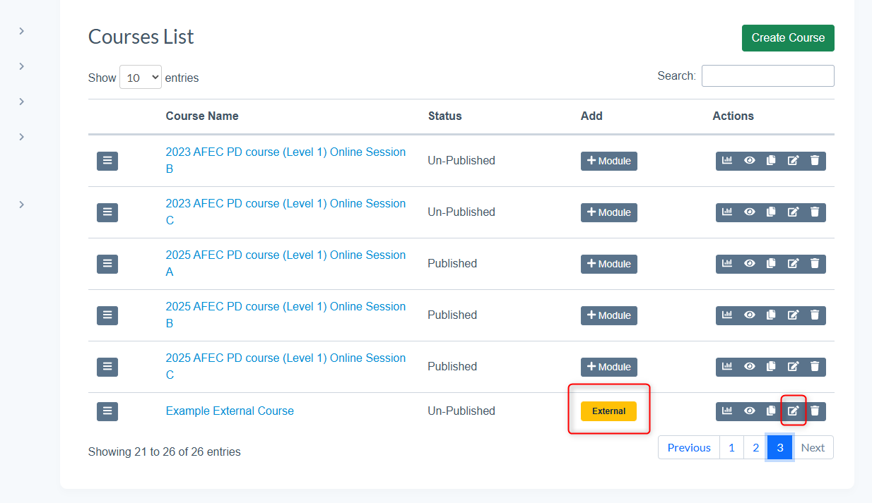 - The new course will now show in the Course List as 'External'