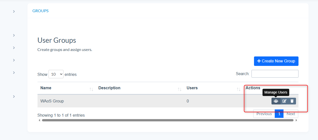 - To add users to a group select the 'Manage Users' button
