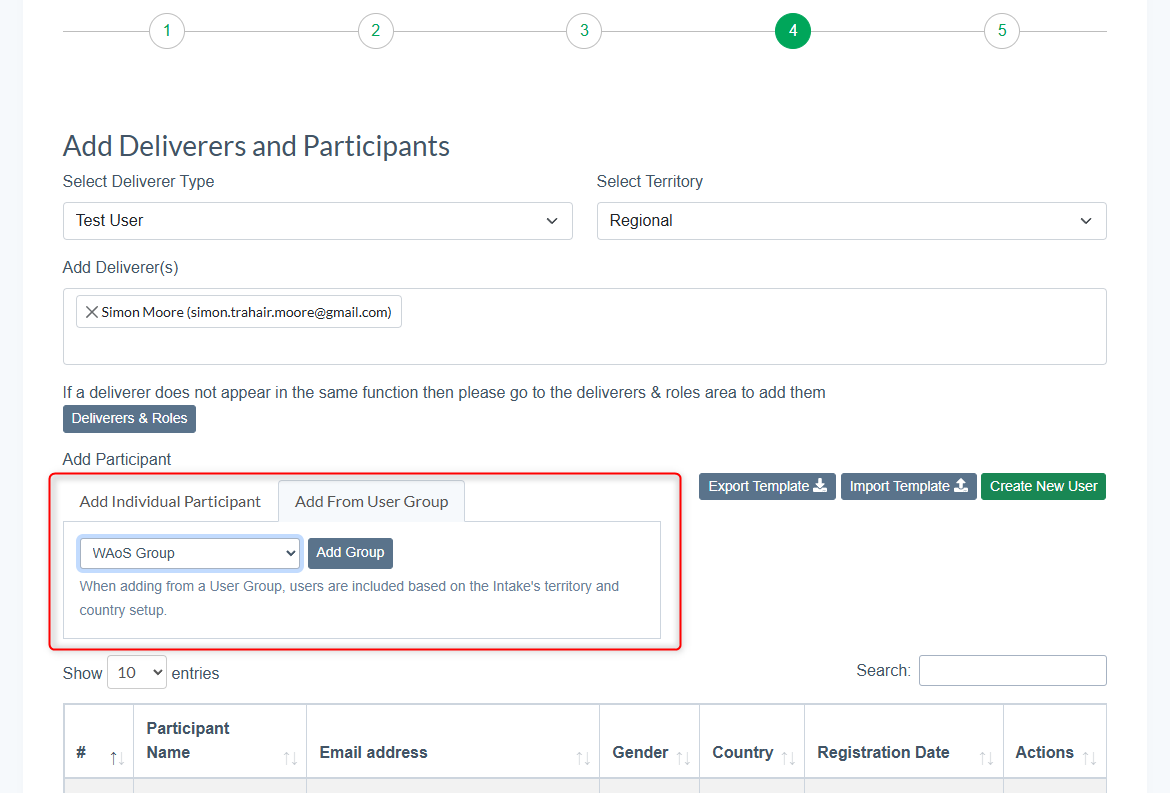 - In the Add Participant section of the course intake settings select the 'Add From User Group' tab